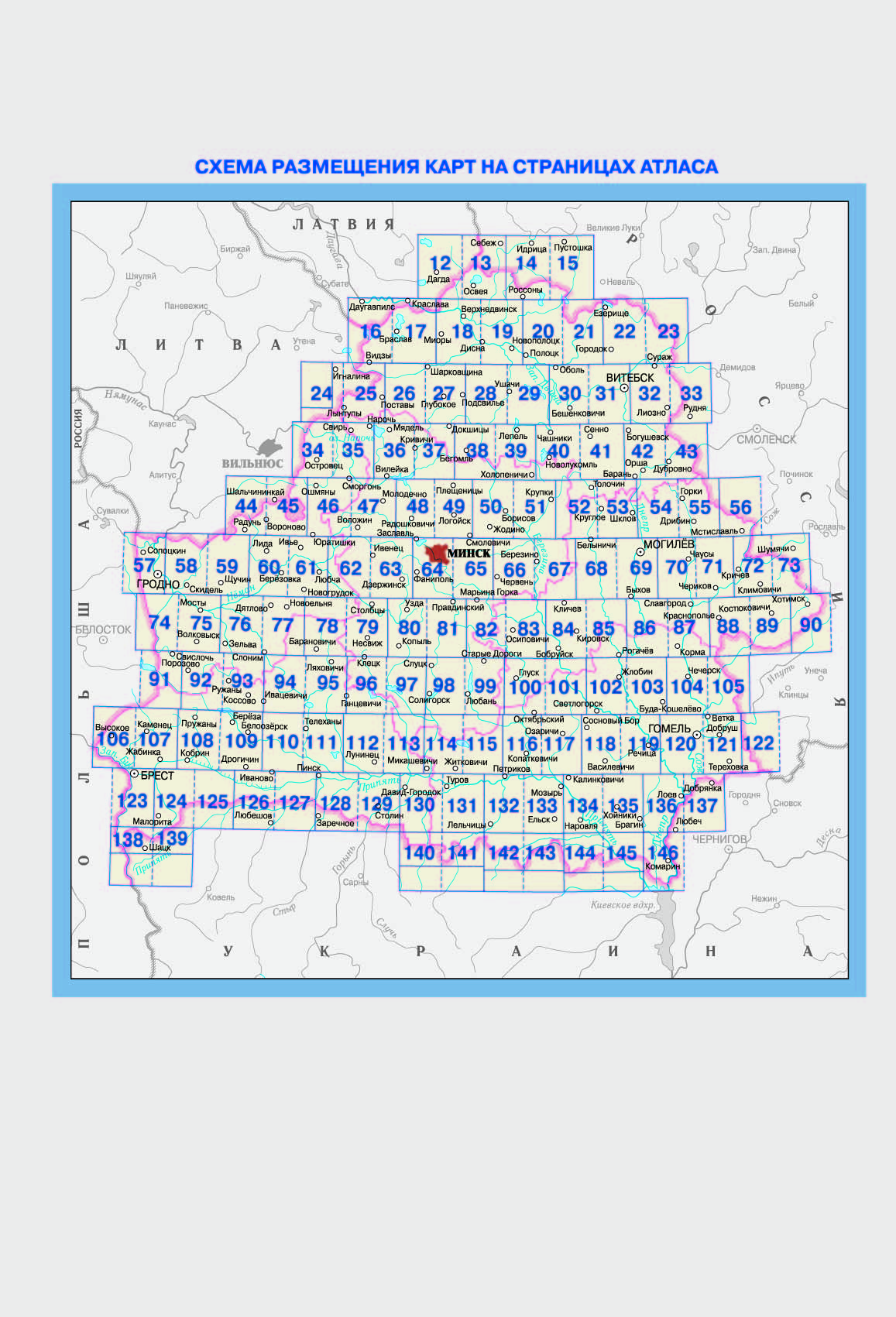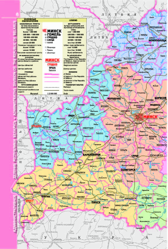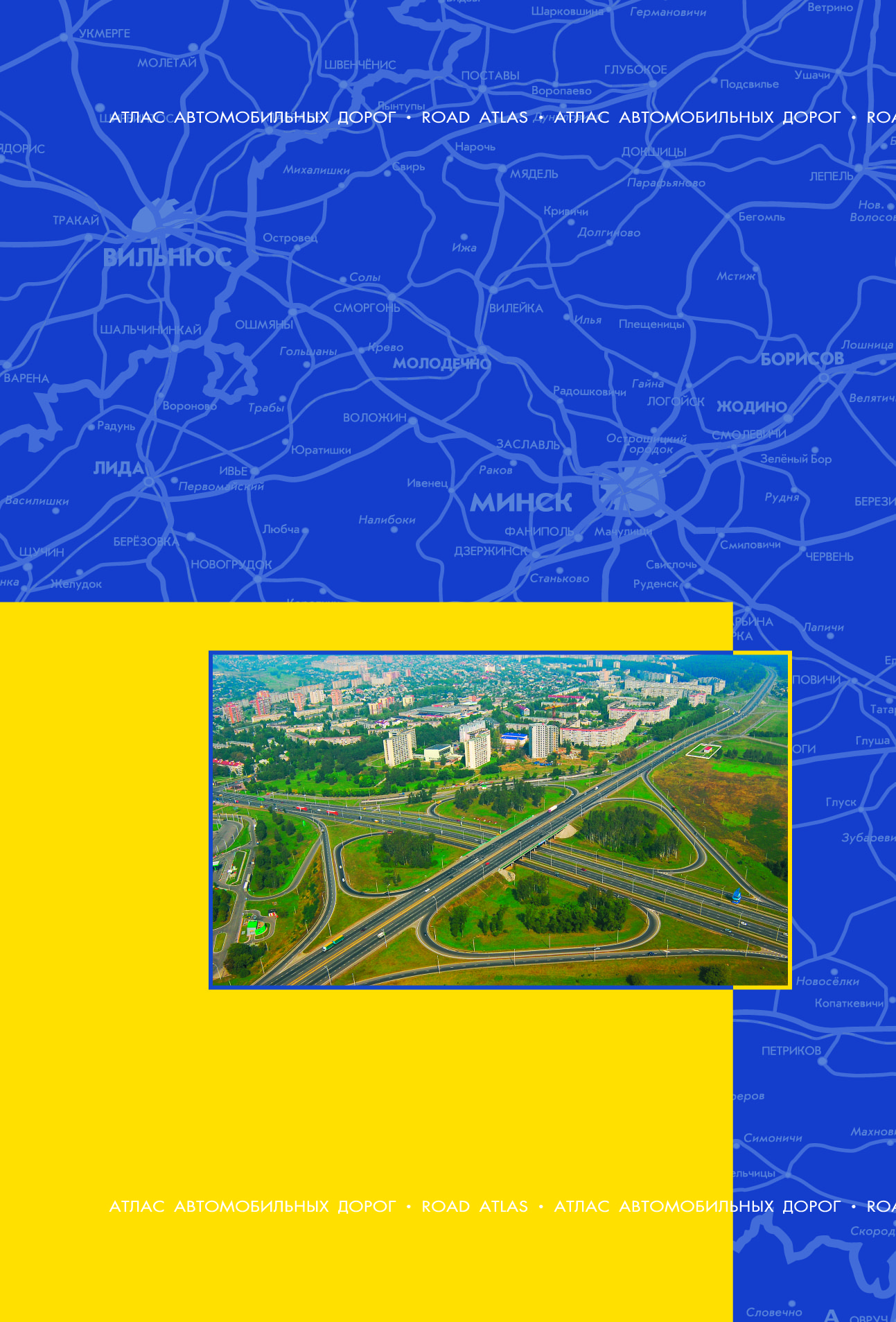 На страницах атласа расположена подробная карта автомобильных дорог Республики Беларусь в масштабе 1: 200 000. На карту, помимо автодорог, нанесена железнодорожная сеть, объекты дорожного сервиса (автозаправочные станции, станции технического обслуживания, гостиницы, кемпинги, мотели), важнейшие памятники истории, архитектуры, военно-исторические памятники и памятные места и многое другое.
