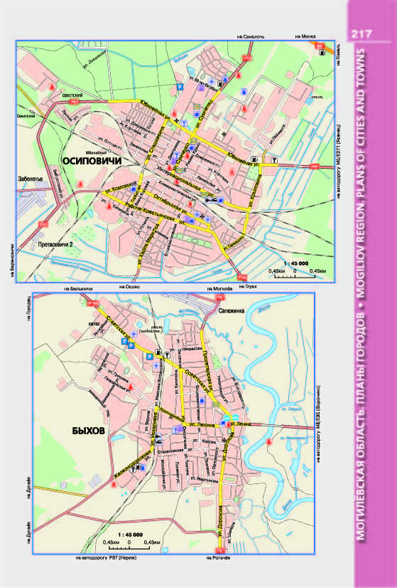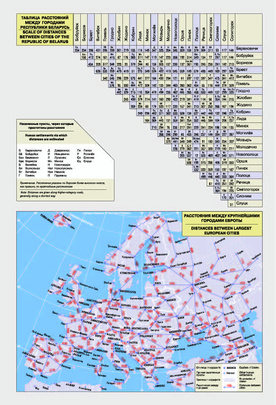 Также на страницах атласа даны планы городов Беларуси (в масштабах от 30:000 до 70:000), карты важнейших дорог Европы (масштаб 1:17 000 000) и Беларуси (масштаб 1: 2 000 000). Отдельно указаны номера и наименования автодорог Беларуси. Показано административно-территориальное деление республики. Приведены дорожные знаки. В конце атласа размещены таблицы расстояний между крупнейшими городами Европы, городами Республики Беларусь.