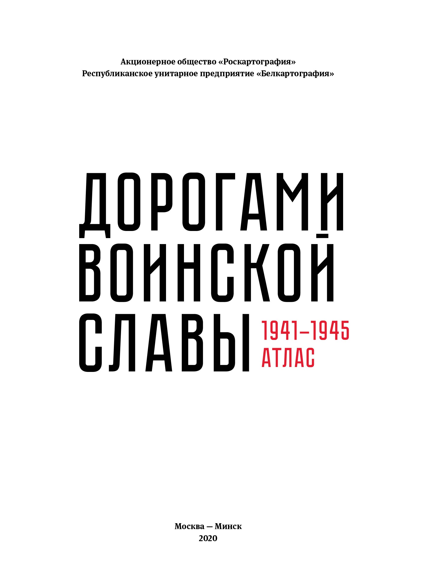 Атлас «Дорогами воинской славы 1941–1945 гг.», совместный белорусско-российский проект, созданный РУП ”Белкартография“ и АО ”Роскартография“ к 75-летию Победы в Великой Отечественной войне. В атласе представлены карты крупнейших сражений Великой Отечественной войны, имеющих важнейшее значение для хода войны и истории в целом, карты отдельных битв за города и рубежи, а также карты боевых действий партизан на оккупированных врагом территориях. Память о тяжелых дорогах войны, которые пришлось пройти воинам-победителям, сохраняется в мемориальных комплексах, возведенных в память о военных событиях, экспозициях музеев, обелисках полководцам и неизвестным героям, отдавшим жизнь за освобождение народов от фашизма. Вся эта информация представлена на современных общегеографических картах территории Беларуси и западных областей европейской части России.