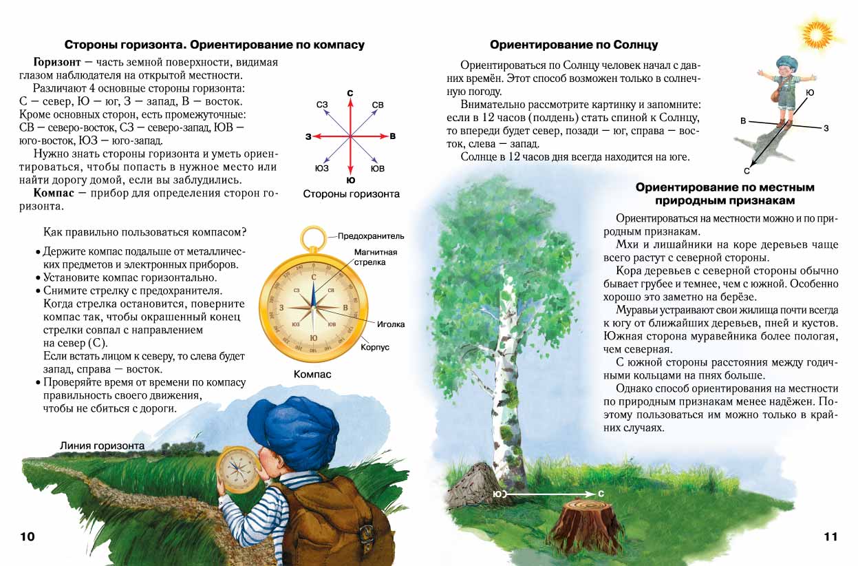 Знакомство с атласом начинается с вида Земли из космоса. Вы узнаете, почему день сменяет ночь, что вызывает смену времен года, научитесь ориентироваться на местности по компасу, по Солнцу, по местным природным признакам. Научитесь читать карту с помощью условных знаков.