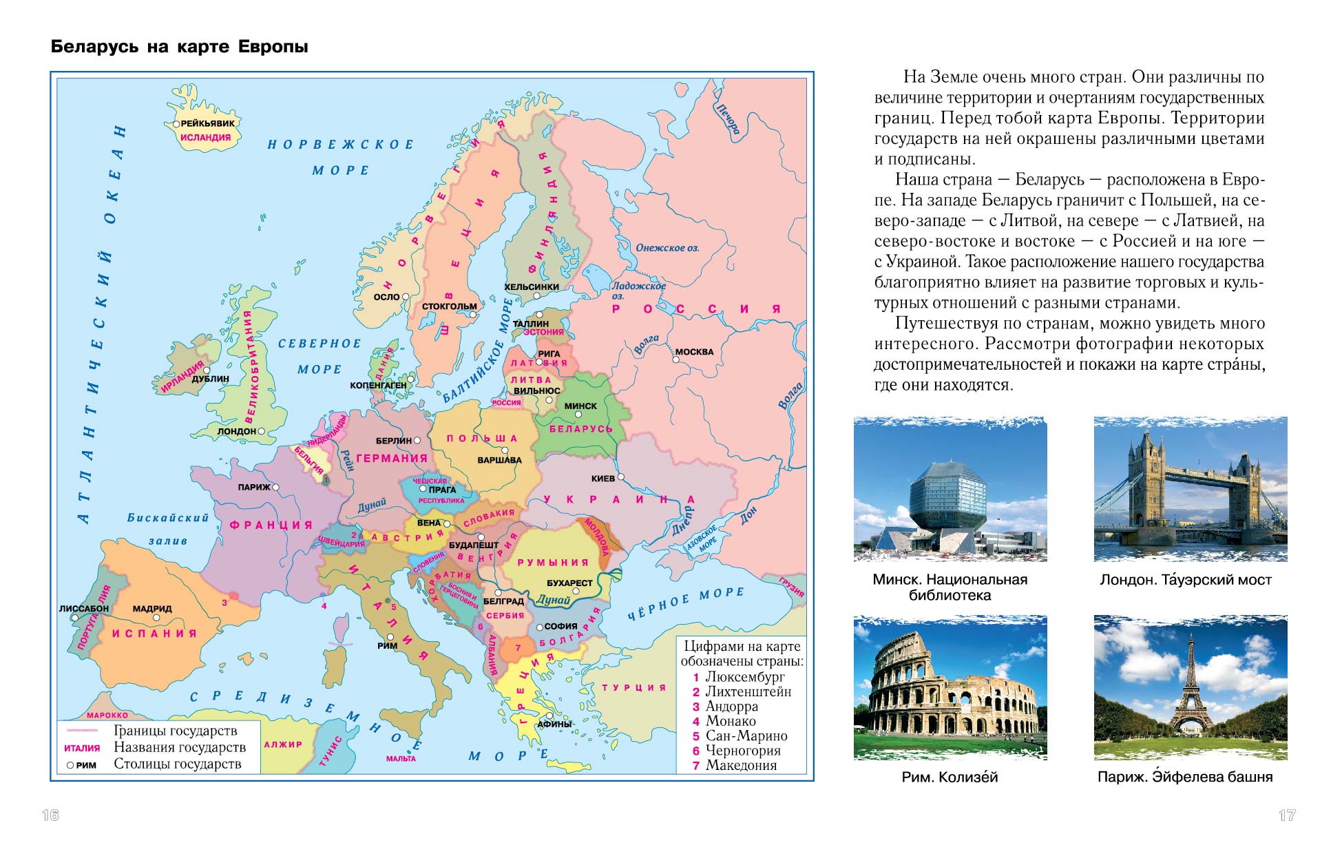 В компании друзей атласа Катей, Петей и Ваней, вы совершите увлекательные путешествия в разные уголки нашей планеты. Большое количество иллюстраций, фотографий, справочных текстов помогут узнать много нового об окружающем мире, его устройстве и происхождении. Особое внимание уделено нашей родине – Республике Беларусь – особенностям ее животного и растительного мира, богатству недр, многообразию форм земной поверхности. Размер атласа 30 х 22 см.